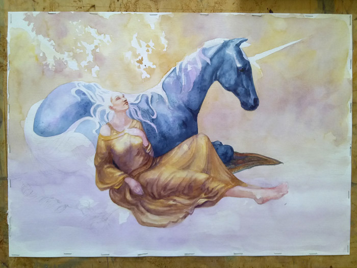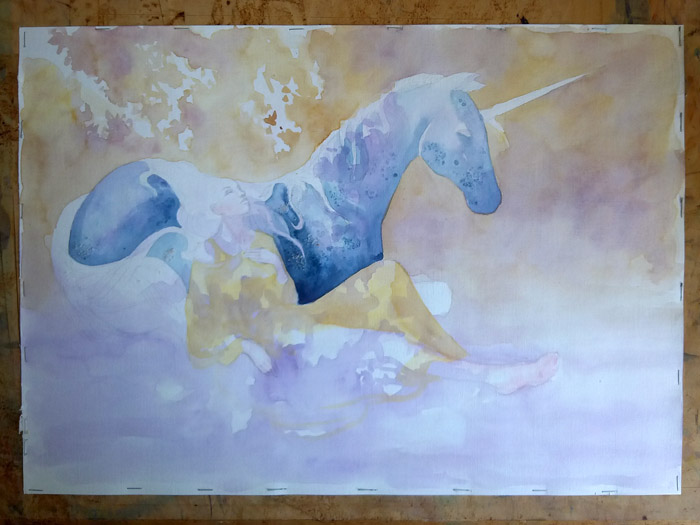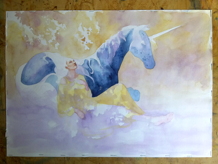 Rooibos tea stains aren’t the only trick a watercolourist can use–introducing salt and rubbing alcohol into still-wet areas make for some cool textures, and these were employed in “Vesica Pisces” and “White Dragon Rider”.