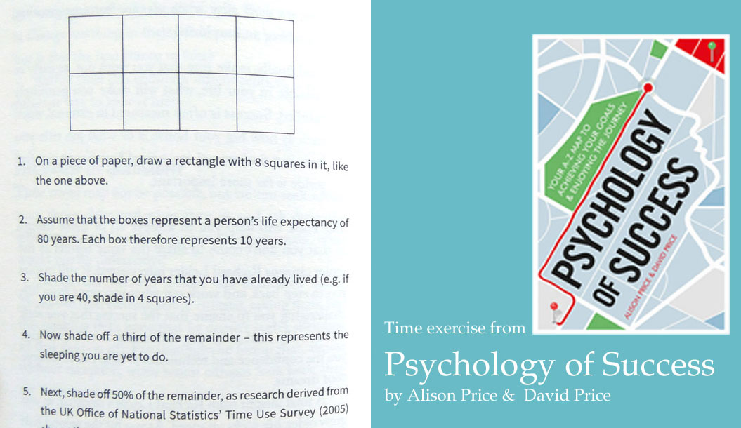 From the excellent Psychology of Success, it starts off with a simple diagram that will take 2 seconds to draw. Assuming you’ll live to 80, you shade the boxes to represent the time you have left to do whatever you’ve been pushing to One Day. Sleeping, eating, working and entertainment time get subtracted as well.
